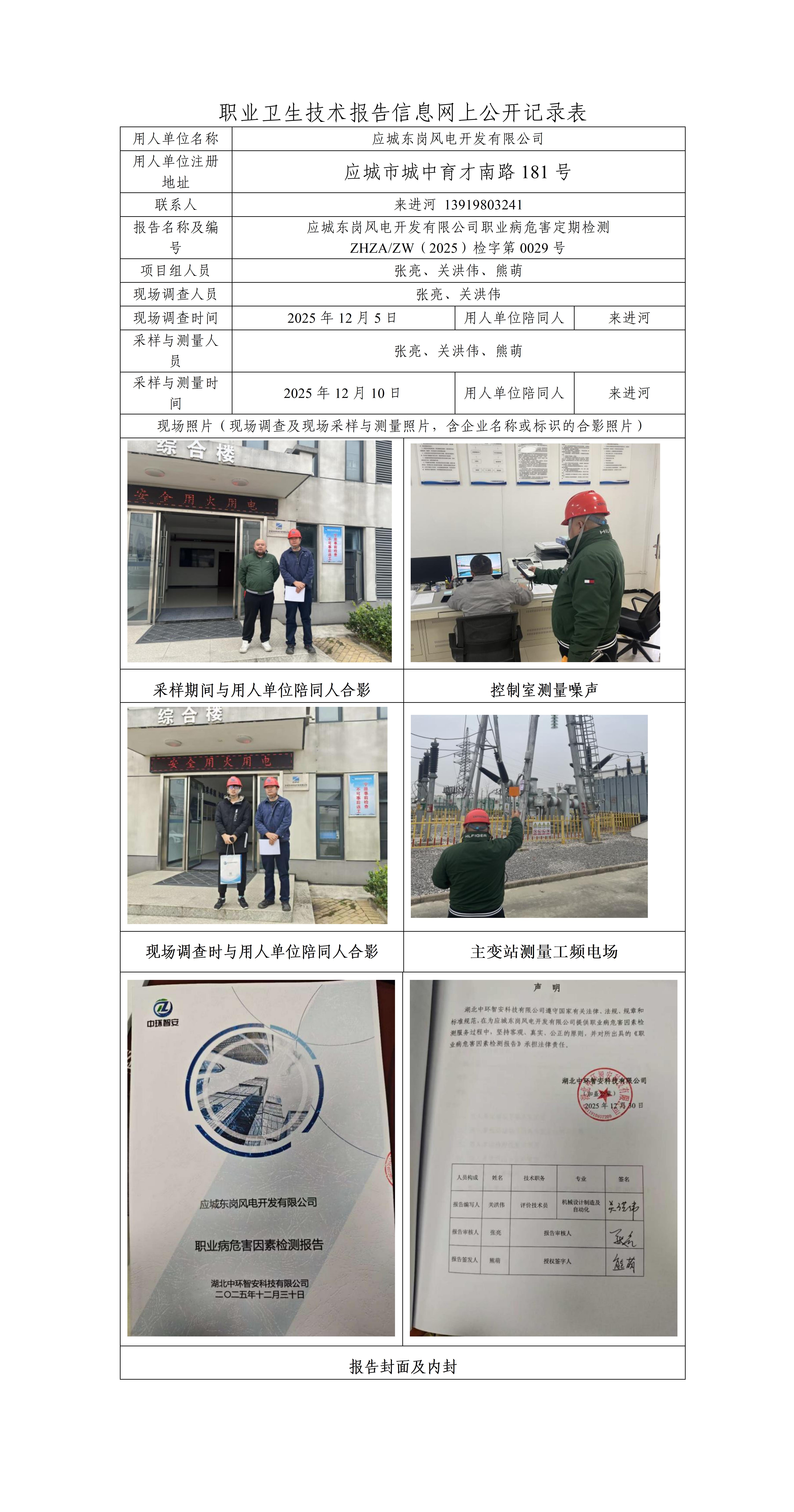 应城东岗风电开发有限公司职业病危害检测报告
